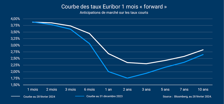 Depuis le début de l’année, les taux du marché ont rebondi sur toutes les échéances, après une fin d’année 2023 marquée par leur repli. En cause : l’évolution des anticipations de marché relatives aux baisses de taux des banques centrales. Alors que le consensus tablait en fin d’année dernière sur 6 baisses de taux de la Fed et 7 baisses de taux de la BCE en 2024, l’anticipation est désormais d’environ 3 baisses de taux pour les deux banques centrales (chaque baisse de taux valant 25 points de base).