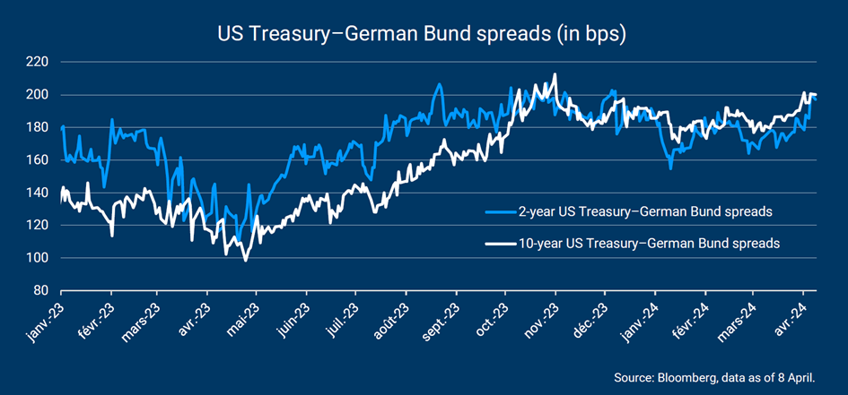 Als gevolg hiervan verwachten de markten minder renteverlagingen door de Fed in 2024 en verschuiven ze de timing. Terwijl de prognoses van een paar weken geleden uitkwamen op drie renteverlagingen dit jaar, gaan de huidige prognoses uit van één of twee, te beginnen in september. Daarentegen wordt nog steeds verwacht dat de ECB de rente vanaf juni drie keer zal verlagen. Christine Lagarde bevestigde deze verwachting tijdens de persconferentie van de ECB op 11 april, toen ze verklaarde dat de ECB data-afhankelijk is en niet Fed-afhankelijk.
