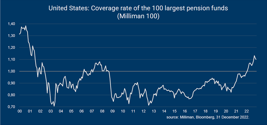 Voor het eerst in meer dan twaalf jaar hebben de Amerikaanse pensioenfondsen weer een overschot. Deze pensioenfondsen moeten gedurende tientallen jaren pensioenverplichtingen dekken. De geactualiseerde waarde van deze verplichtingen vormt hun passiva. Daartoe beleggen zij hun activa op de financiële markten.