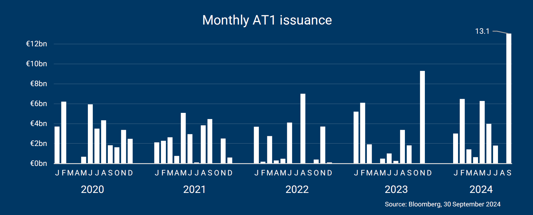 In september was er een ongekende activiteit op de primaire markt voor AT1-obligaties, met een totale uitgifte van meer dan €13 miljard. Sinds de oprichting van deze markt in 2014 was de maandelijkse uitgifte van AT1-obligaties nog nooit boven de drempel van €10 miljard uitgekomen.