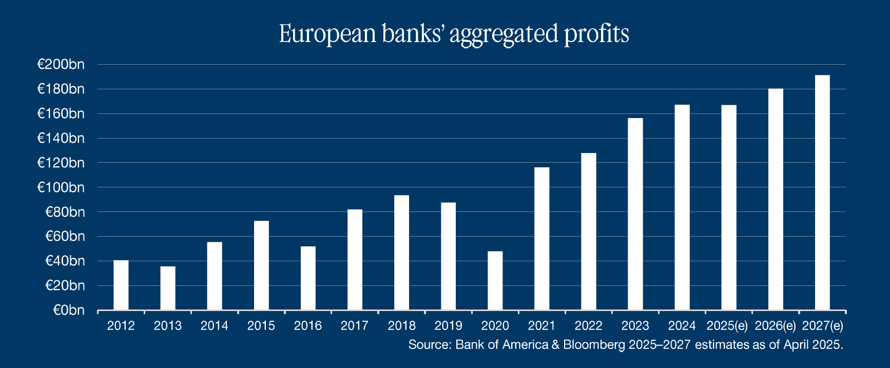 Ondanks de recente macro-economische onzekerheden blijven de winsten van Europese banken volgens de laatste gegevens van Bank of America de komende twee tot drie jaar goed op koers. De analisten verwachten weliswaar een lichte daling van de winsten in 2025 ten opzichte van 2024, maar een herstel van de groei in 2026 en 2027.