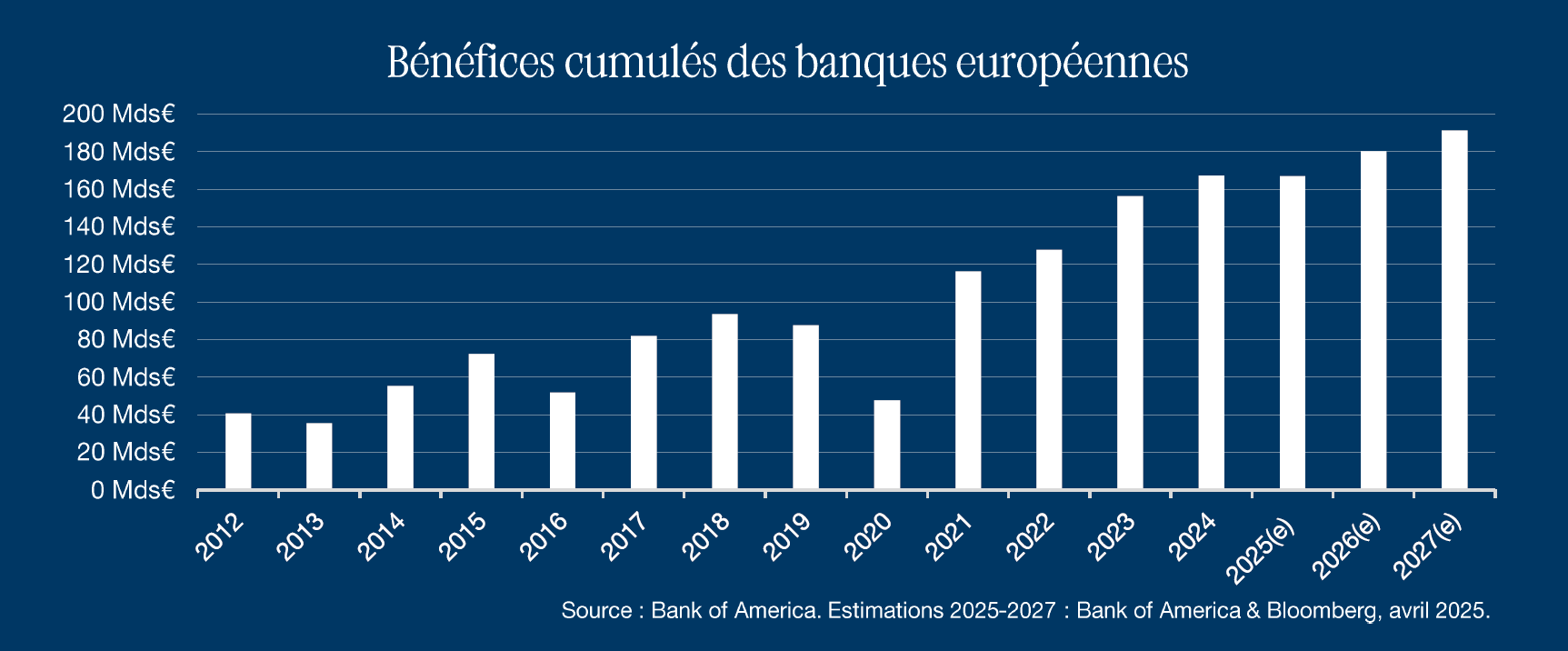Le secteur bancaire bénéficie en effet de plusieurs atouts dans le contexte actuel. Tout d’abord, il n’est pas directement concerné par le sujet des droits de douane, bien qu’il y soit indirectement exposé à travers la santé économique de son portefeuille de prêts.