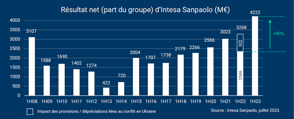 La hausse des profits des banques s’explique par un environnement de taux plus élevés, mais aussi par un coût du risque toujours très bas. Au second semestre 2022, le rendement des capitaux propres (ROE) des banques italiennes avait atteint 9,1% en moyenne, son plus haut niveau depuis le S2 2007 (données BCE), et devrait s’avérer encore plus élevé pour le premier semestre 2023.