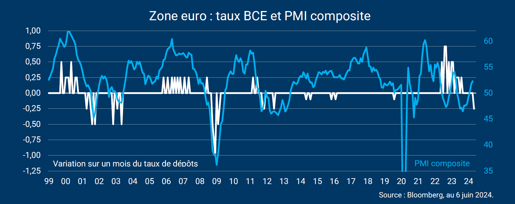 Comme le montre le graphique ci-dessus, lorsque l’inflation globale s’orientait vers 0%, la BCE n’a jamais baissé ses taux lorsque l’indice PMI composite était supérieur au niveau actuel (exception faite de la période 2014-2016). Au-delà de la question de l’inflation, si l’activité économique continue de se redresser, l’ampleur totale du cycle de baisse des taux, actuellement attendue autour de 150 points de base, pourrait donc être réévaluée. Autant de raisons, pour la BCE, de ne pas trop s’engager.