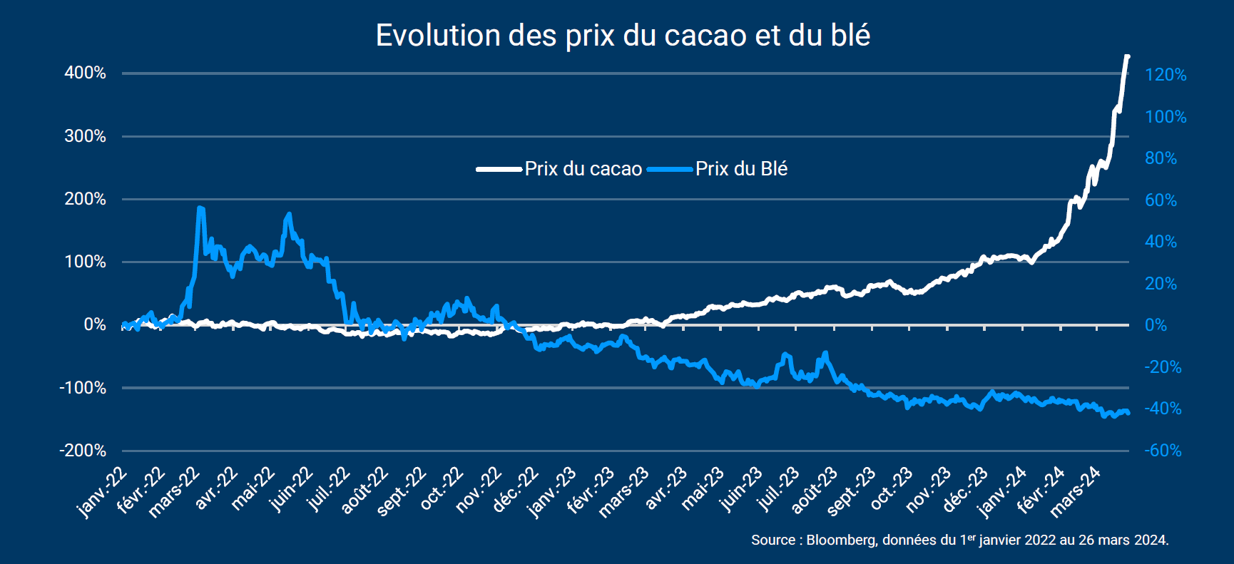 Cette hausse du prix du cacao contraste avec l’évolution du prix du blé au cours des deux dernières années : après une progression de +56% en mars 2022, consécutive à l'invasion de l'Ukraine par la Russie, ce marché affiche désormais une baisse de -44% depuis le 1er janvier 2022.