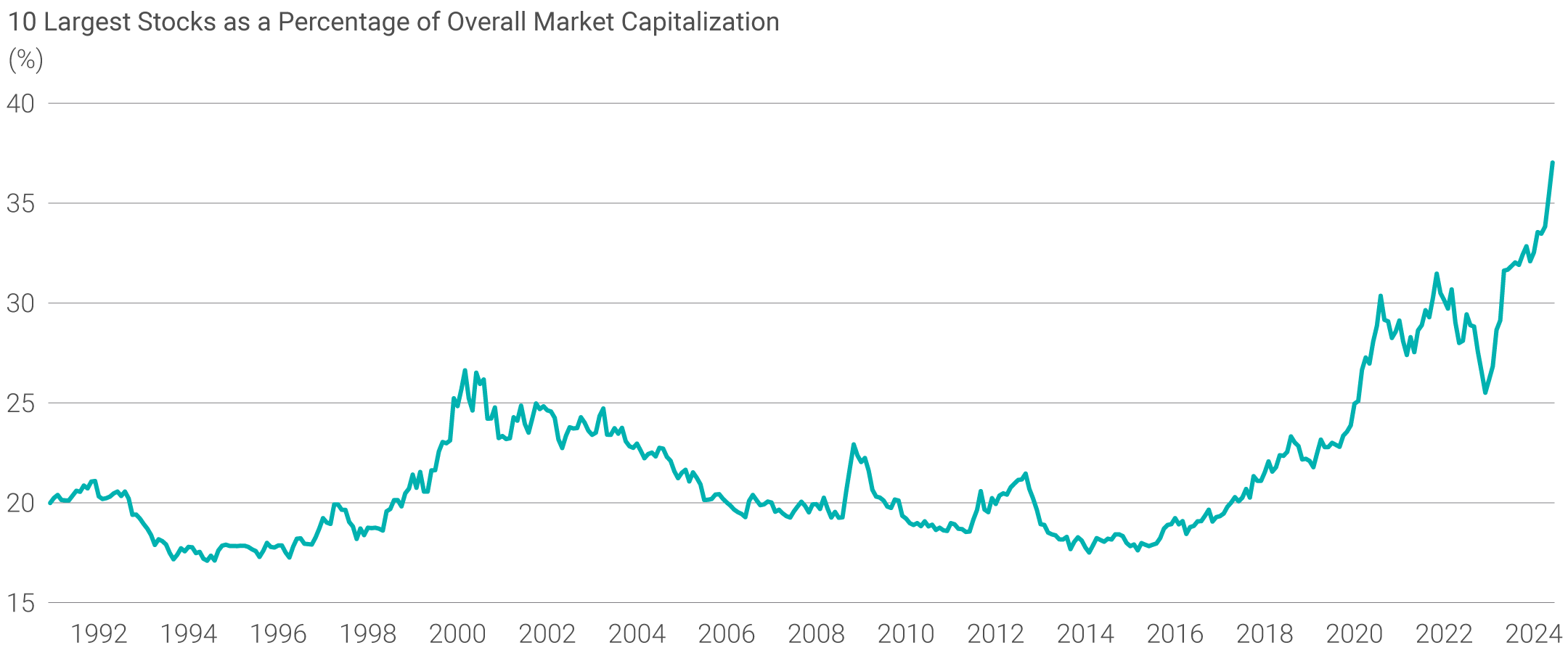 Les indices de référence sont désormais plus concentrés. Au 30 juin 2024, les 10 premières valeurs de l'indice S&P 500 représentaient 36 % de l'indice de référence, contre 17 % dix ans plus tôt. Dans le même temps, Apple, Nvidia et Microsoft représentent plus de 20 % de la capitalisation de l'indice.1
