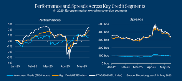Ondanks de daling van de spreads blijven de rendementen op de vervaldag nog steeds boven de inflatie, met ongeveer 3% voor investment grade en 6% voor high yield en AT1-achtergestelde schulden, tegenover een stabiele inflatie van 2,2% in de eurozone in april 2025 (Eurostat-gegevens over 12 opeenvolgende maanden).