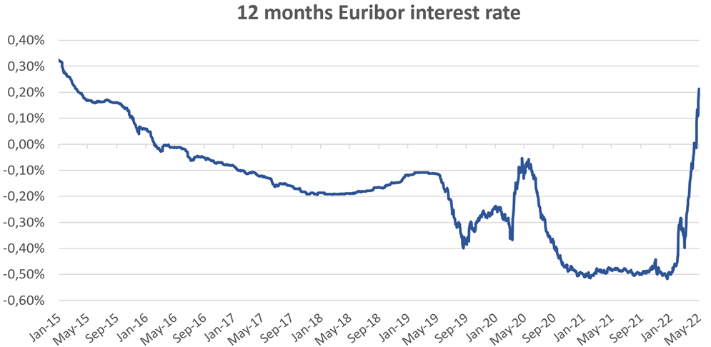 Sinds begin 2022 is de Euribor op 12 maanden met 72 basispunten gestegen, van -0,50% tot +0,22%. Daarmee heeft de rente opnieuw zijn hoogste niveau bereikt sinds maart 2015, de periode die overeenstemt met de lancering van de eerste kwantitatieve versoepeling door de ECB.