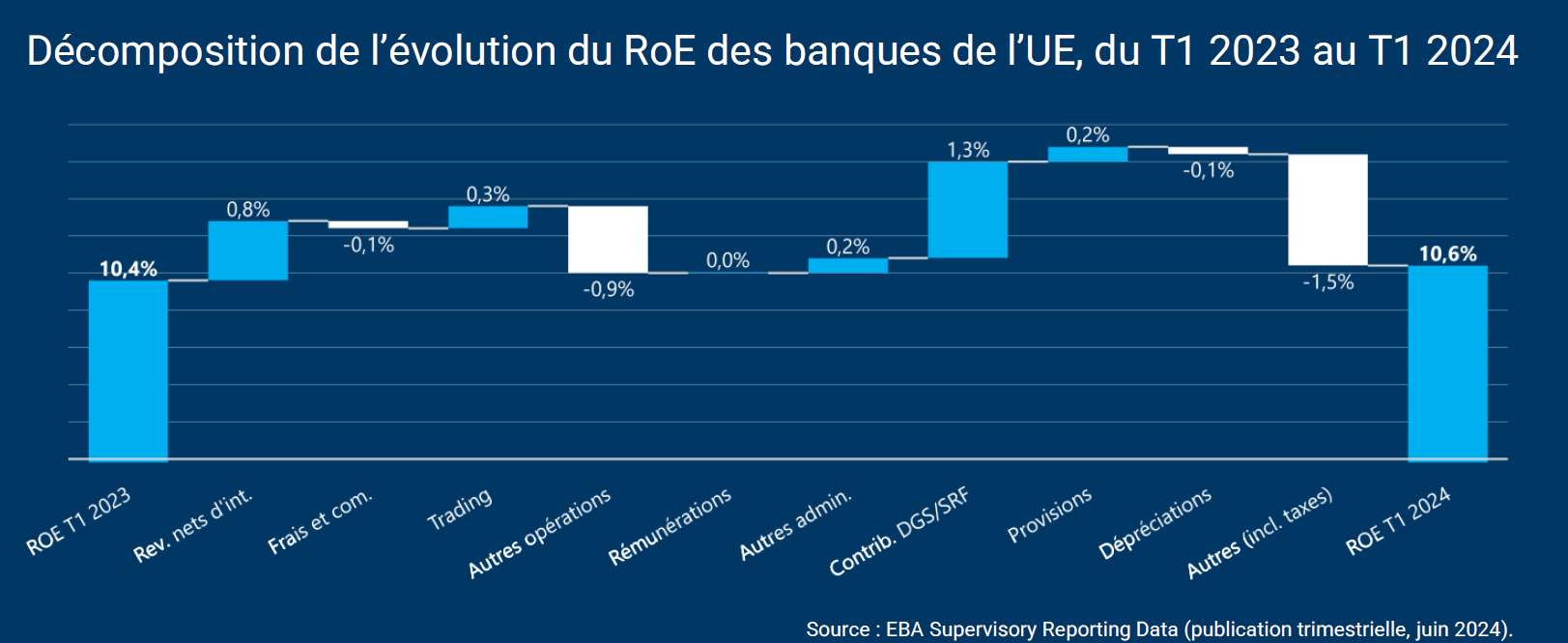 Pour bien identifier les différents contributeurs associés à cette croissance des résultats, l’autorité bancaire européenne (EBA) a mis en avant dans son dernier « tableau de bord des risques » la décomposition de l’évolution du rendements des fonds propres (RoE) des banques entre le T1 2023 (10,4%) et le T1 2024 (10,6%).