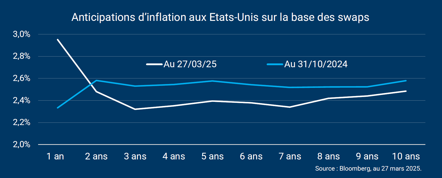Les anticipations d’inflation sont pour l’instant alignées avec la théorie d’un choc temporaire. En effet, elles montrent une anticipation d’inflation à 3% pour l’année à venir. Au-delà, l’inflation devrait se stabiliser autour de 2,5%, soit le niveau qui était globalement attendu avant l’élection de Donald Trump.