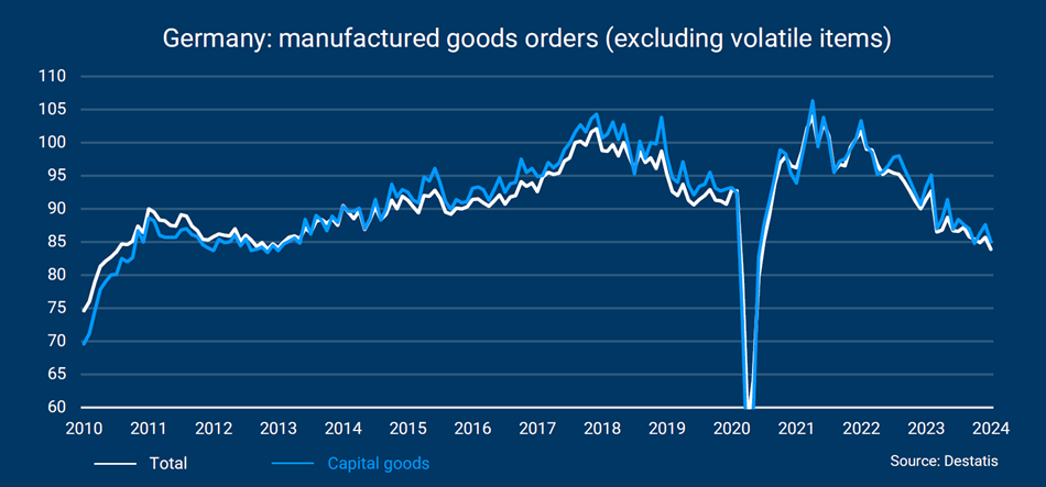 Een vergelijkbaar beeld komt naar voren uit de gegevens waarin volatiele posten zijn weggelaten. Met name de orders voor kapitaalgoederen wijzen neerwaarts. De orders voor consumptiegoederen zijn de afgelopen twee maanden met 8% gedaald, nadat ze eerder goed stand hadden gehouden.
