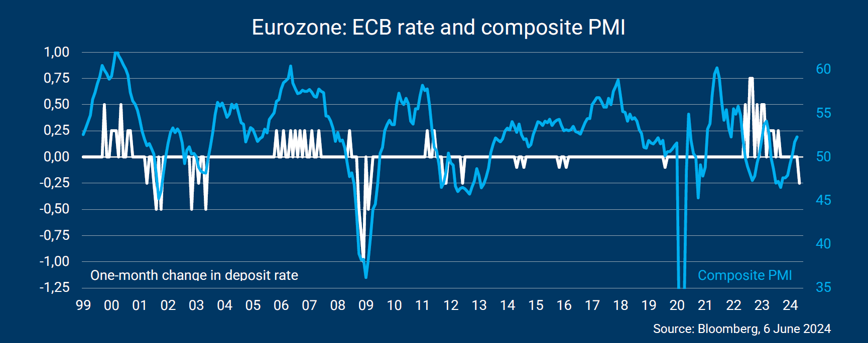 De grafiek van deze week laat zien dat wanneer de inflatie richting 0,0% gaat, de ECB de rente meestal niet verlaagt als de samengestelde PMI boven het huidige niveau ligt (behalve tussen 2014 en 2016). Afgezien van de inflatie zou een aanhoudende economische groei aanleiding kunnen zijn om de huidige verwachting van een renteverlagingscyclus van in totaal 150 basispunten bij te stellen. Wij denken dat deze factoren de ECB een goede reden geven om zich niet van tevoren te vast te pinnen.