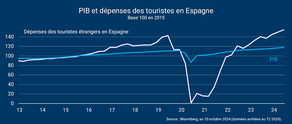 S’il n’explique pas tout, le tourisme a indéniablement contribué à la relance de l'économie espagnole. Après une chute en 2020, les dépenses des touristes étrangers en Espagne ont fortement rebondi et continuent de croître à un rythme plus rapide que le reste de l’économie. Elles représentent désormais près de 3,8 % du PIB.