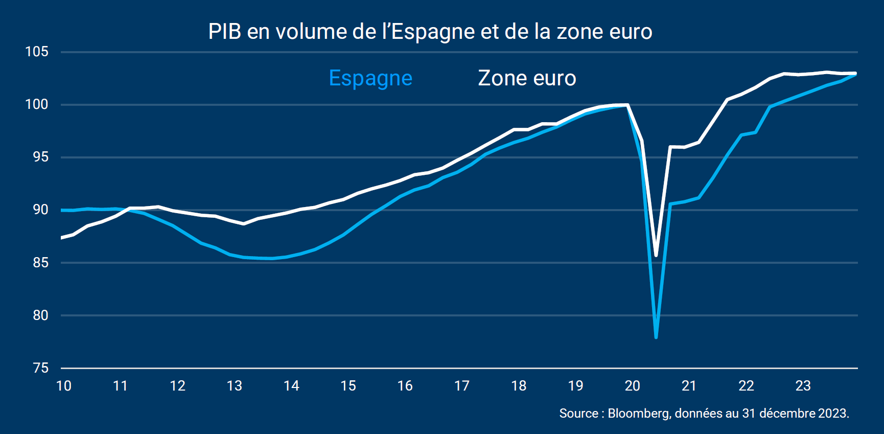 Comme le montre le graphique ci-dessous, cette dynamique favorable a permis au PIB espagnol de rattraper le retard accumulé depuis la crise Covid par rapport au reste de la zone euro. L’Espagne et la zone euro voient leur PIB en hausse de près de 3% depuis le quatrième trimestre 2019.