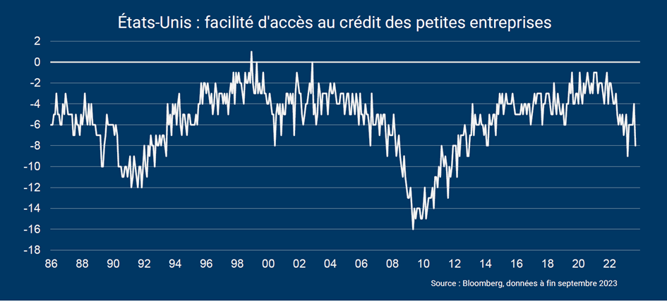 Fin juillet, l’enquête trimestrielle sur les conditions d’octroi de crédit des banques avait montré un nouveau durcissement de celles-ci. Parallèlement, les taux d’intérêt ont fortement progressé et le « spread » des obligations émises par les entreprises américaines de moins bonne qualité s’est nettement écarté d’environ 380 à 440 points de base (indice BofA US High Yield ) entre la mi-septembre et début octobre, ce qui peut avoir un impact indirect sur les marges demandées par les banques.