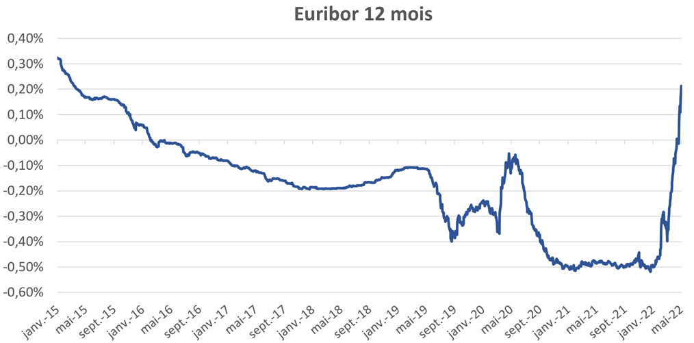 Depuis le début d’année 2022, l’Euribor à 12 mois a progressé de 72 points de base, passant de -0,50% à +0,22%. Le taux est ainsi revenu à son plus haut niveau depuis mars 2015, période correspondant au lancement du premier « quantitative easing » de la BCE.