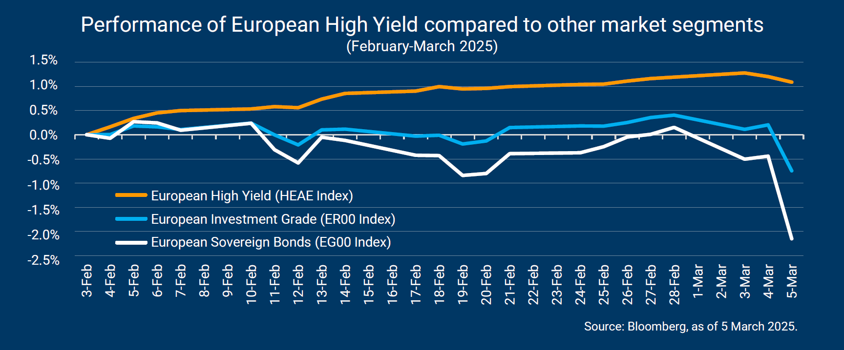 Europees high yield profiteerde ook van een vernauwing van de spreads (-14 basispunten op 5 maart), wat bijdroeg aan de veerkracht. De markten zagen het “ReArm Europe”-plan als een vorm van fiscale stimulans die gunstig is voor de Europese groei, vandaar de verkleining van de spreads op het High Yield-segment. Dit ging hand in hand met een positieve trend voor Europese aandelen.