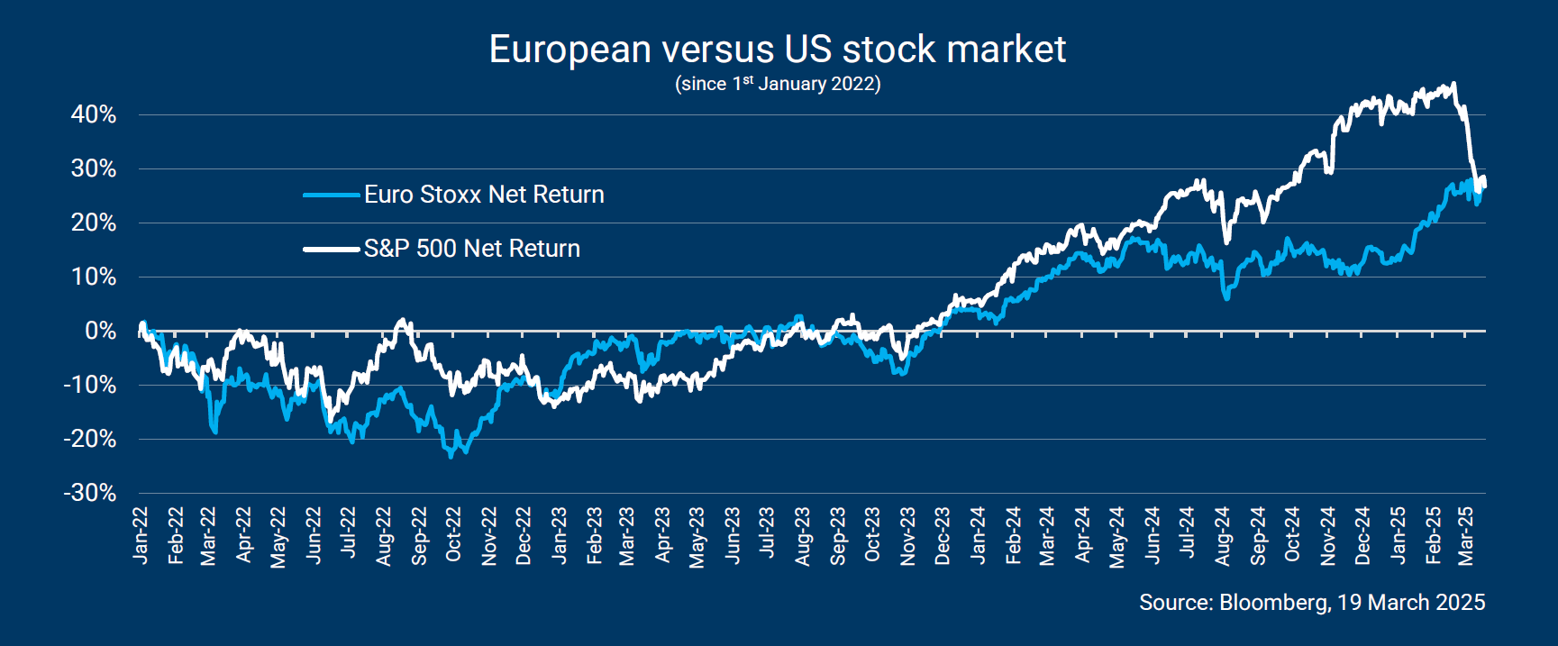 Deze marktbeweging is zowel te wijten aan een verslechtering van de indicatoren voor de kracht van de Amerikaanse economie als aan een veel positiever sentiment ten opzichte van de Europese economie. De aankondiging van het plan ReArm Europe en de herziening van de Duitse begrotingsdoctrine worden gezien als twee belangrijke pijlers van een begrotingsimpuls die de groei waarschijnlijk zal doen opleven.