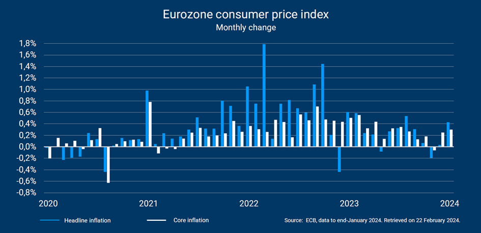 Het basiseffect van de hoge inflatie in februari 2023 zou het jaar-op-jaarcijfer voor februari 2024 moeten verzachten. Maar de laatste inflatiecijfers zullen de ECB er niet van overtuigen dat het de goede kant op gaat met de consumentenprijzen.