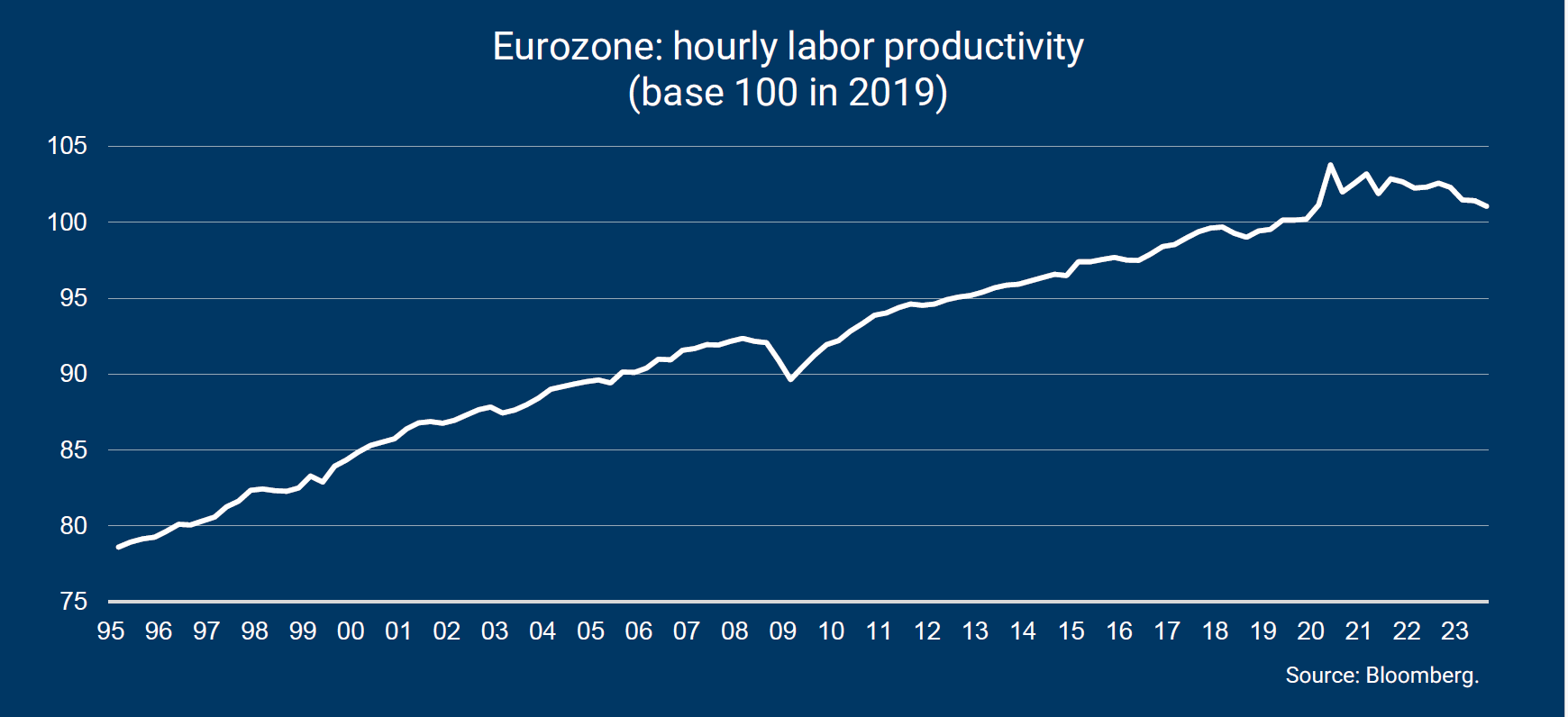 Nu de inflatie afneemt, zal de inkomstengroei lager zijn en de bedrijven zouden de productiviteitsdaling kunnen compenseren door hun personeelsbestand aan te passen. Op de langere termijn is dit fenomeen ook problematisch, aangezien de productiviteit een drijvende kracht is achter de potentiële groei, vooral in een context van een slinkende beroepsbevolking in Europa.