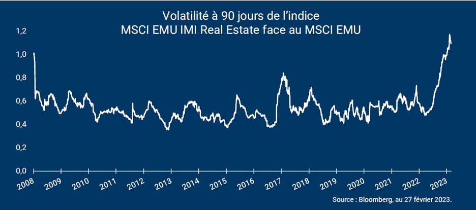 Le secteur des foncières a été l’un des plus affectés par la hausse des taux en 2022. L’indice MSCI EMU IMI Real Estate (indice européen des foncières) a ainsi reculé de 36% l’an dernier, contre un recul de seulement 12% pour l’indice MSCI EMU (moyenne des marchés européens). La volatilité relative du secteur des foncières européennes cotées par rapport à l’indice général s’est accentuée au point de dépasser les seuils historiques atteints lors de la crise financière de 2008/2009, illustrant l’intensité des débats qui animent actuellement les investisseurs vis-à-vis de ce secteur.
