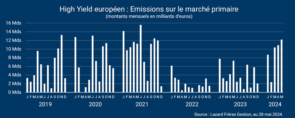 Depuis le début d’année, les émissions obligataires sur le segment High Yield européen atteignent des montants mensuels au plus haut depuis 2021. Ainsi, depuis le 1er janvier 2024, près de 45 milliards d’euros ont déjà été émis sur le marché, soit l’équivalent de l’ensemble des émissions de l’année 2023 (47 milliards d’euros) et près du double de 2022 (25 milliards d’euros).