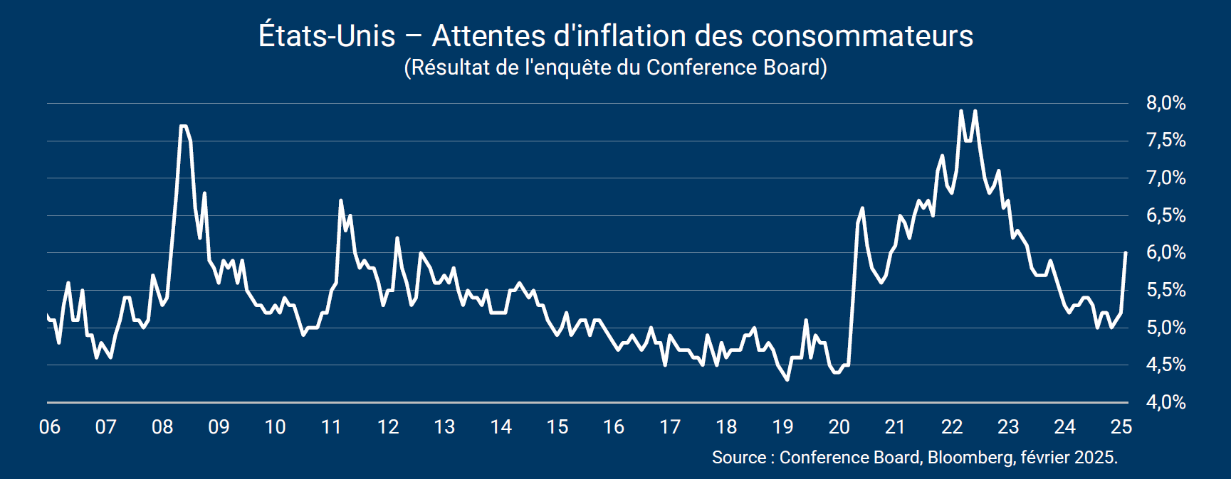 Historiquement, la perception de l’inflation par le consommateur est souvent supérieure à la réalité ou aux anticipations de marché. Cependant, la hausse des derniers chiffres d’inflation brute (3%) et sous-jacente (3,3%) en janvier ne contribue pas à apaiser ce ressenti. La multiplication des menaces de droits de douane par la nouvelle administration joue à l’évidence sur le sentiment d’une hausse à venir.