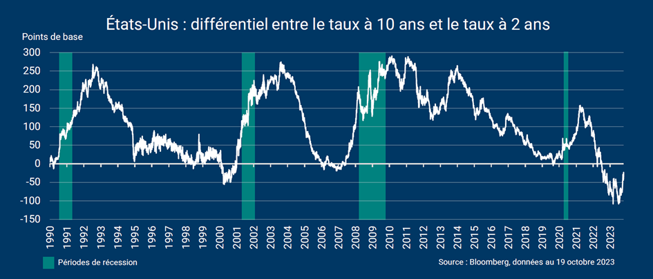 Toutefois, depuis le mois de septembre 2023, les taux longs poursuivent leur progression tandis que les taux courts restent globalement stables. Par conséquent, la pente négative de la courbe des taux est désormais moins forte : le taux à 10 ans américain remonte face au taux à 2 ans. Or, historiquement, ce phénomène est précurseur d’une entrée en récession, comme le montre le graphique ci-dessous.