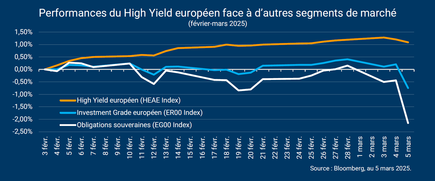 Le mouvement du 5 mars a permis d’illustrer la capacité de résistance du segment High Yield face à certains chocs. Ce marché a notamment bénéficié ici de la courte maturité moyenne des titres qui le composent (inférieure à 4 ans actuellement), ce qui le rend relativement peu sensible au risque de hausse des taux. À l’inverse, d’autres segments y sont plus exposés, car constitués de titres de maturités plus longues.