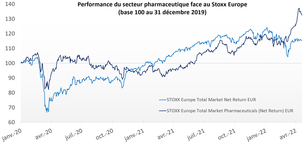 Depuis le début de l’année 2022, le secteur pharmaceutique européen (Stoxx Europe Total Market Pharmaceuticals) enregistre une forte surperformance face à la moyenne du marché (Stoxx Europe Total Market).