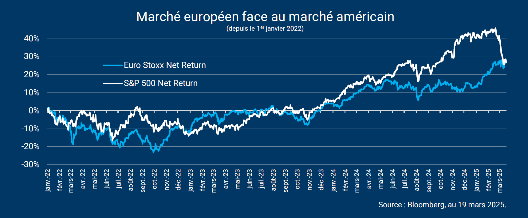 Alors que les actions américaines avaient connu une importante surperformance en 2024 face aux autres segments de marché, un renversement de tendance s’observe depuis la fin du mois de février.