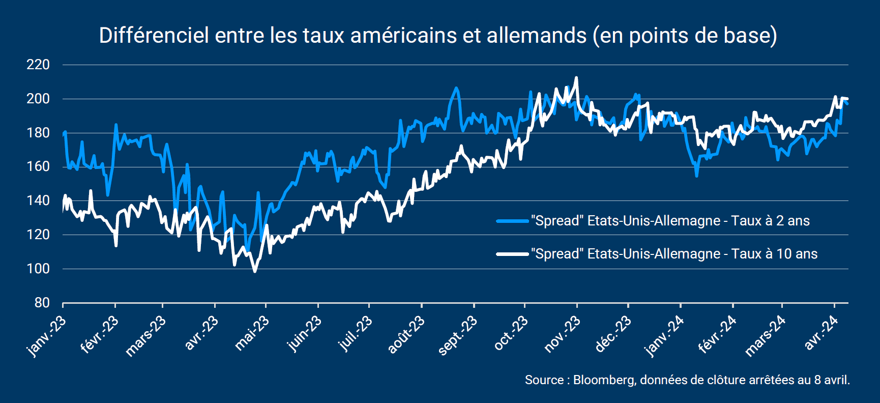 Par conséquent, les marchés ont réduit leur anticipation de repli des taux de la Fed pour cette année et ont repoussé la date de la première baisse. Alors qu’il y a quelques semaines, l’anticipation était encore de 3 baisses des taux en 2024, celle-ci n’est plus que de 1 à 2 baisses de taux, dont une première intégrée pour le mois de septembre. Côté BCE, le consensus de marché pointe toujours vers 3 baisses de taux, dont une première en juin. Cette anticipation a été confortée lors de la conférence de presse de la BCE du 11 avril, au cours de laquelle Christine Lagarde a affirmé que la BCE ne dépendait pas de la Fed en matière de politique monétaire (« We are not Fed-dependant »).