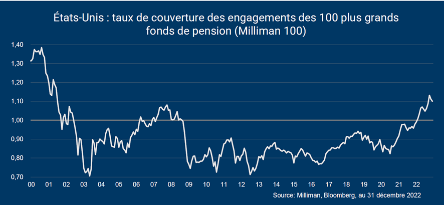 En 2022, la valeur de ces actifs a baissé de 18%, en ligne avec le fort recul des marchés actions et des marchés obligataires. Toutefois, en parallèle, l’effet de la hausse des taux sur le taux d’actualisation a fait baisser leur passif de 27%. Ce taux d’actualisation, correspondant peu ou prou au rendement à maturité des obligations d’entreprises de bonne qualité, est passé de 2,8% à 5,2%.