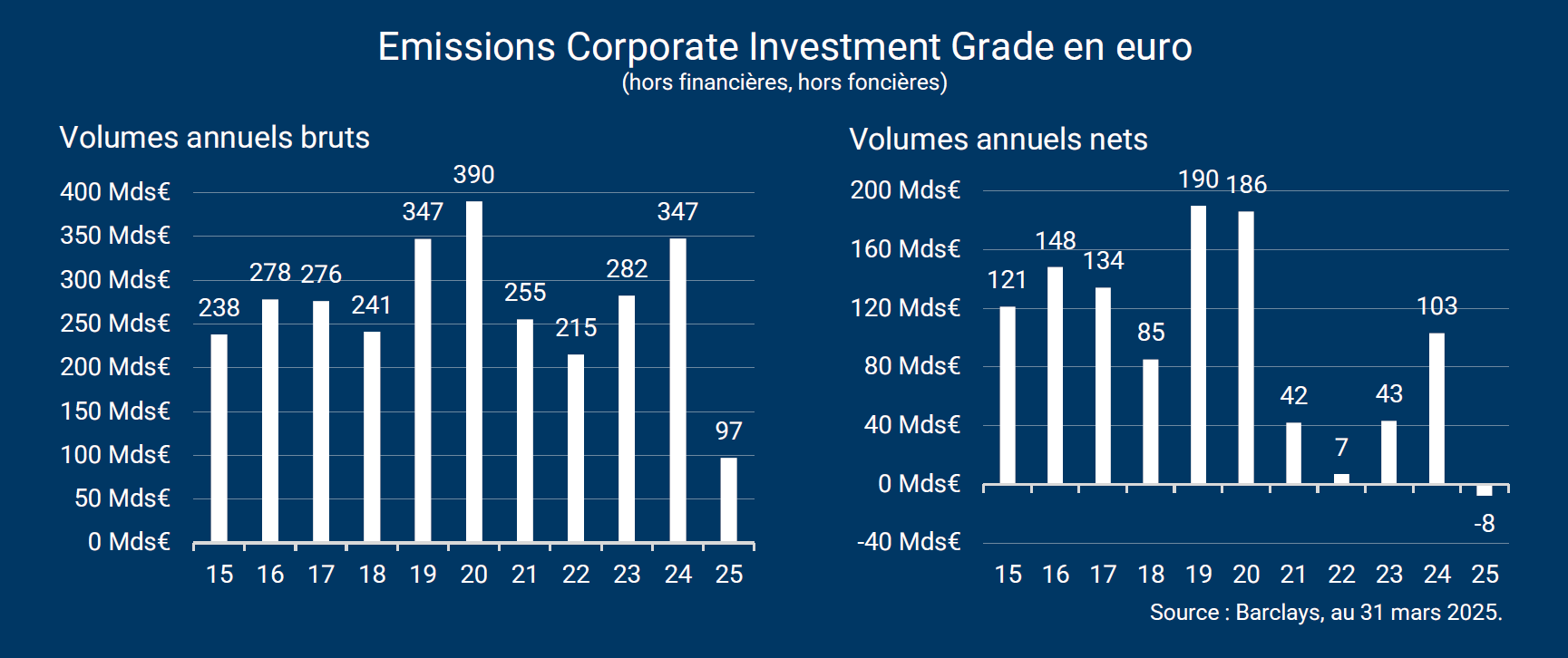 En revanche, l’offre nette du segment Corporate Investment Grade (correspondant à la différence entre les nouvelles émissions et les remboursements) s’avère légèrement négative depuis le début de l’année (-8 milliards d’euros, contre +41 milliards d’euros au T1 2024). Ces dernières années, les émissions nettes étaient restées largement positives à l’exception de l’année 2022, marquée par une forte volatilité conjuguée à certaines craintes des investisseurs et des entreprises face à la hausse des taux.