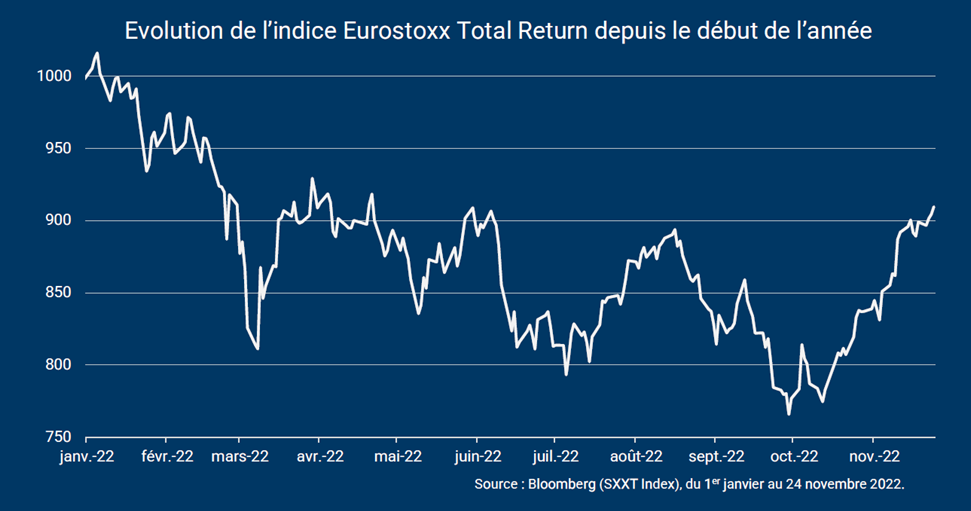Le récent rebond des marchés actions européens est le fruit d’une conjonction de facteurs. La saison des résultats d’octobre-novembre a été bonne et a permis de rassurer les investisseurs sur la capacité des entreprises à faire face à l’inflation. Par ailleurs, les prix du gaz en Europe (TTF) ont connu un recul notable lié à une météo clémente et des stocks européens élevés à l’approche de l’hiver. Les prix du pétrole se sont maintenus sous la barre des 100 dollars/baril et les cours des matières premières agricoles ont connu une détente liée à la reconduction de l’accord d’exportation des céréales ukrainiennes. On notera enfin que l’euro a regagné du terrain face au dollar au cours des dernières semaines, relâchant la pression qui pesait sur les épaules de la BCE pour remonter ses taux directeurs à un rythme soutenu.