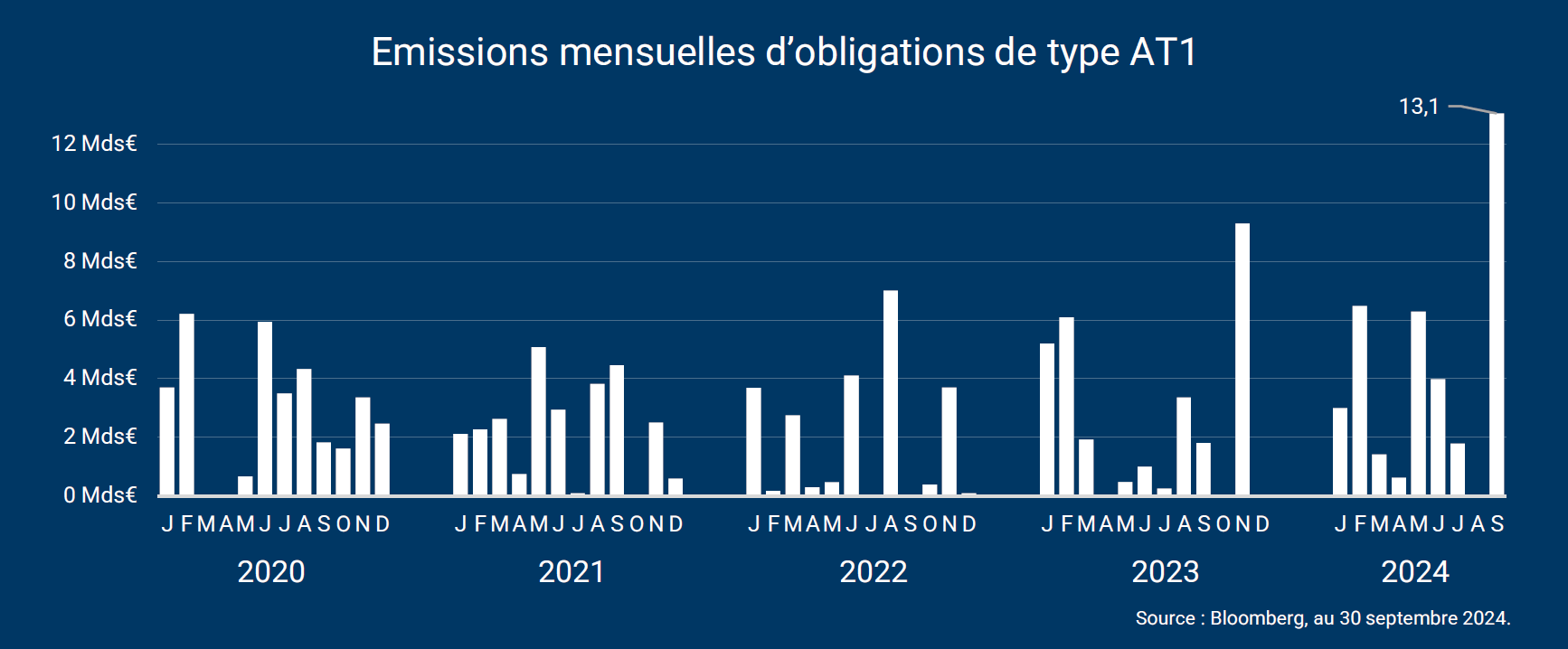 Au cours du mois de septembre, le marché primaire des obligations AT1 a connu une activité sans précédent, avec l’émission de titres pour une valeur totale de plus de 13 milliards d’euros. Depuis la création de ce marché en 2014, les émissions mensuelles d’AT1 n’avaient jamais dépassé le seuil des 10 milliards d’euros.