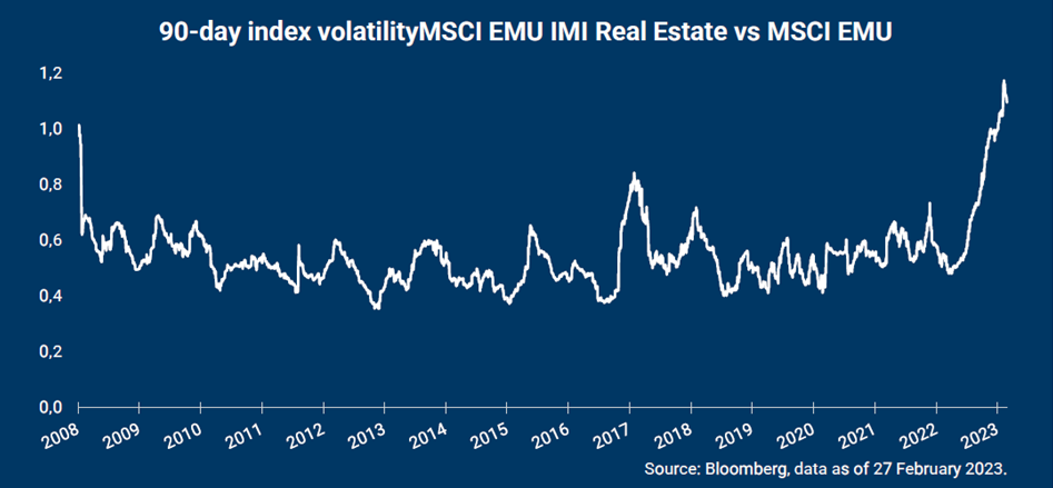 De vastgoedsector is een van de zwaarst getroffen sectoren als gevolg van de stijgende rente in 2022. De MSCI EMU IMI Real Estate Index (Europese vastgoedindex) daalde vorig jaar met 36%, tegenover een daling van slechts 12% voor de MSCI EMU Index (gemiddelde van de Europese markten). De relatieve volatiliteit van de Europese beursgenoteerde vastgoedsector ten opzichte van de algemene index steeg tot boven de historische drempels die tijdens de financiële crisis van 2008/2009 werden bereikt.