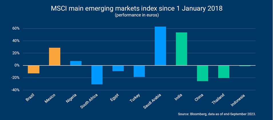 Sinds 1 januari 2018 lieten aandelen in de opkomende markten zeer wisselende rendementen (in euro's) zien. Latijns-Amerika werd gestimuleerd door de stijging van de Mexicaanse markt met 29%, terwijl Brazilië in dezelfde periode met 13% daalde. In Azië steeg de Indiase aandelenmarkt met +53%, wat de terugval in China (-25%) compenseerde. In de EMEA-regio lieten Saoedi-Arabië en Nigeria positieve rendementen zien van respectievelijk 63% en 7%.