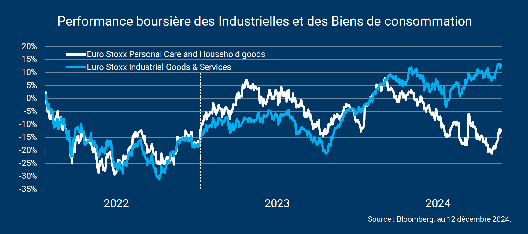 Alors que les performances des indices européens Euro Stoxx Industrial Goods et Euro Stoxx Personal Care étaient comparables sur 2022 et 2023, une forte divergence a pu être observée en 2024.