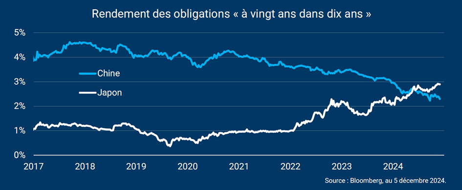 Les taux longs en Chine baissent régulièrement depuis 2021. Inversement, les taux longs au Japon remontent depuis près de deux ans. Les courbes de taux à trente ans viennent ainsi de se croiser : l’emprunt japonais est désormais plus rémunérateur que l’emprunt chinois, à 2,28% contre 2,21%.
