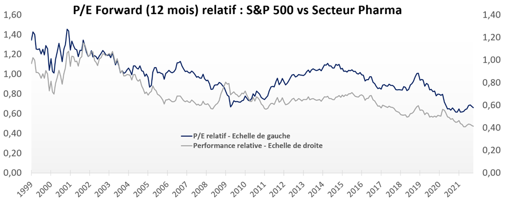 Bien qu’au cœur de l’actualité depuis mars 2020, le secteur pharmaceutique ne fait pas partie des grands bénéficiaires de la crise sanitaire. Au cours des deux dernières années, l’indice américain des valeurs pharmaceutiques (S&P 500 Pharmaceuticals Industry GICS Level 3 Index) a sous-performé face à la moyenne du marché (S&P 500 Net Total Return Index). Cette sous-performance est encore plus visible sur longue période. Les valorisations relatives aux bénéfices (P/E) se sont elles-mêmes contractées par rapport à celles de l’ensemble des autres secteurs.