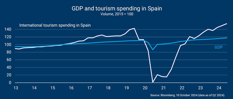 Hoewel toerisme niet de enige factor is, heeft het onmiskenbaar bijgedragen aan het herstel van de Spaanse economie. Na een daling in 2020 zijn de uitgaven van buitenlandse toeristen in Spanje sterk gestegen en blijven ze sneller groeien dan de rest van de economie. Ze zijn nu goed voor bijna 3,8% van het bbp.