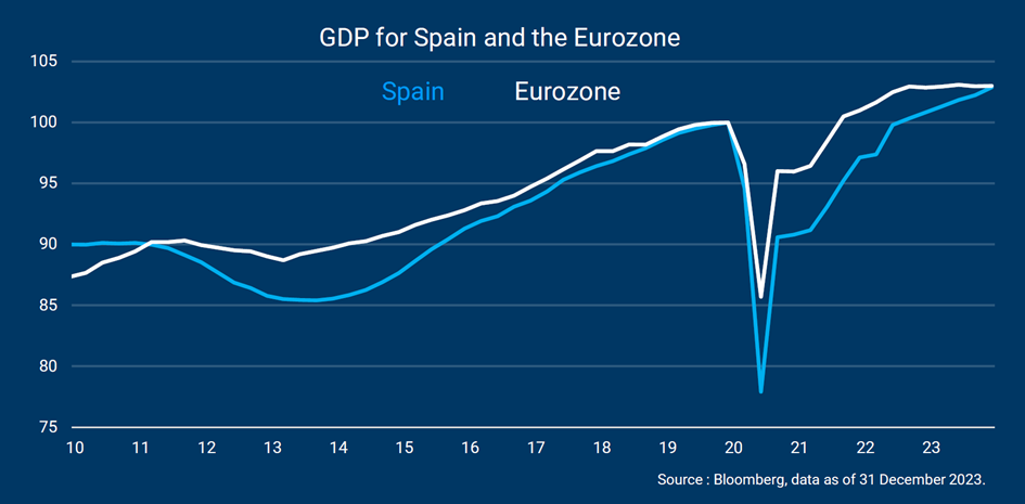 Zoals de grafiek hieronder laat zien, heeft deze gunstige dynamiek het Spaanse bbp in staat gesteld om de opgelopen achterstand sinds de Covid-crisis in te halen ten opzichte van de rest van de eurozone. Zowel Spanje als de eurozone zagen hun bbp sinds het vierde kwartaal van 2019 met bijna 3% stijgen.