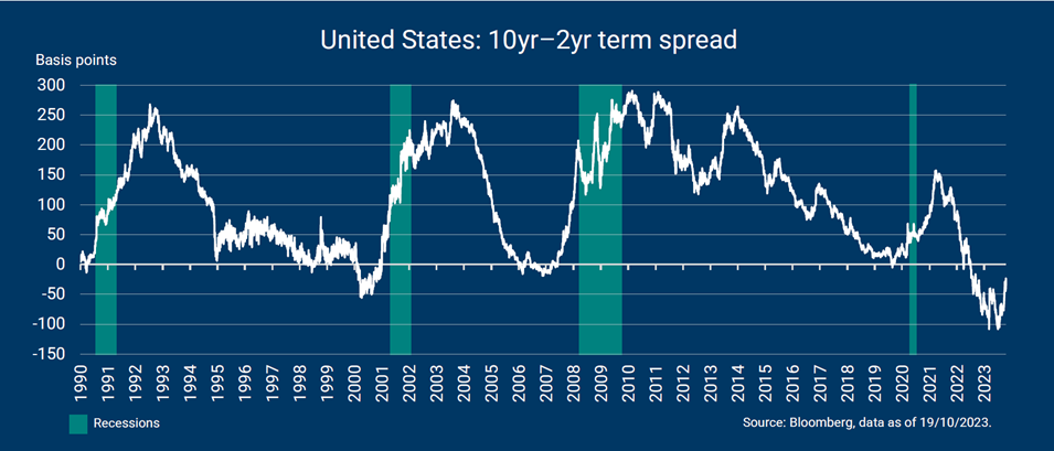 Sinds september 2023 is de lange rente blijven stijgen, terwijl de korte rente over het algemeen stabiel bleef. Het resultaat is een minder steil omgekeerde rentecurve naarmate het rendement van 10-jaars Treasuries stijgt ten opzichte van het 2-jaars equivalent. In het verleden was deze situatie een voorbode van een recessie, zoals onze grafiek hieronder laat zien.