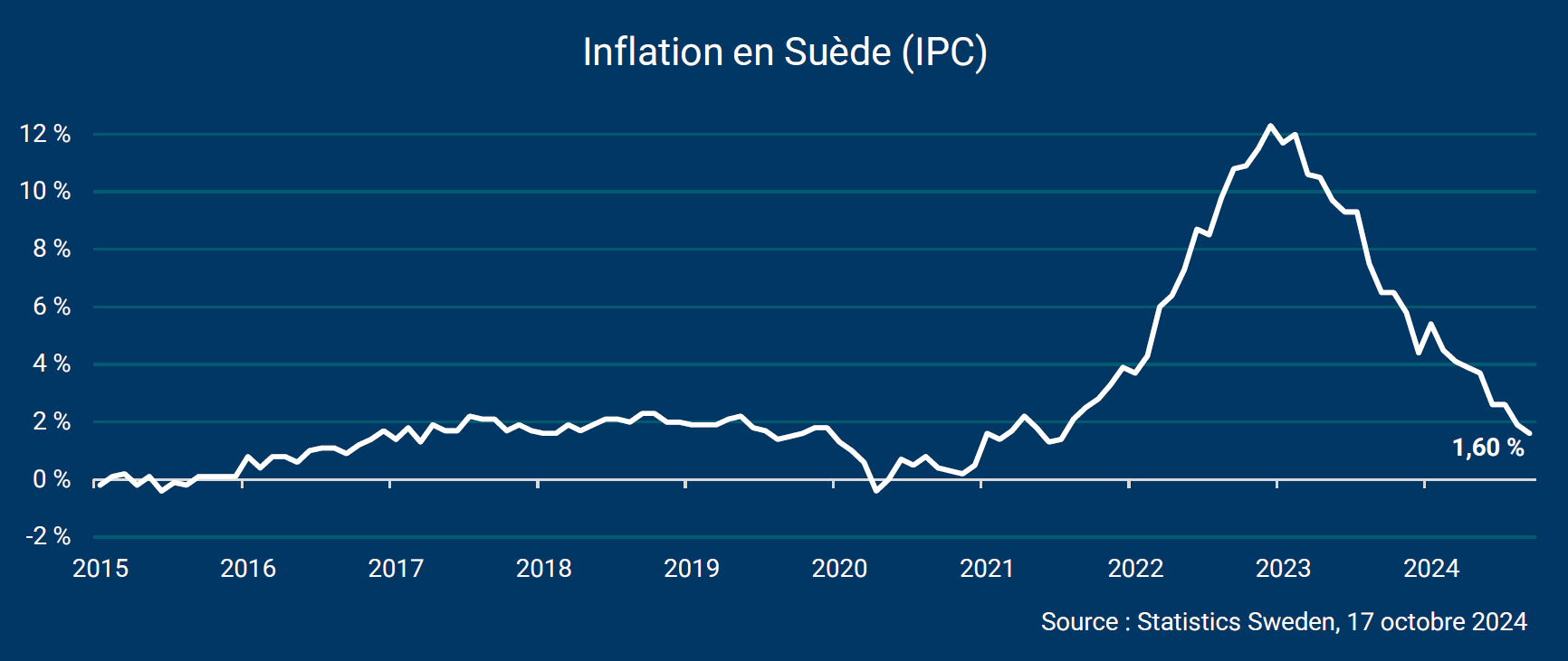 Après une hausse brutale entre 2021 et 2022, la baisse de l'inflation suédoise se confirme au mois de septembre 2024. L’Indice des Prix à la Consommation en Suède passe en effet de 1,9% en août à 1,6% en septembre, nettement en-dessous du seuil de 2% visé par la banque centrale (Riksbank). Celle-ci a baissé ses taux de 75 bps depuis le début de l’année. Ces chiffres du mois de septembre confirment le potentiel de baisse supplémentaire du taux directeur pour 2024 et 2025.
