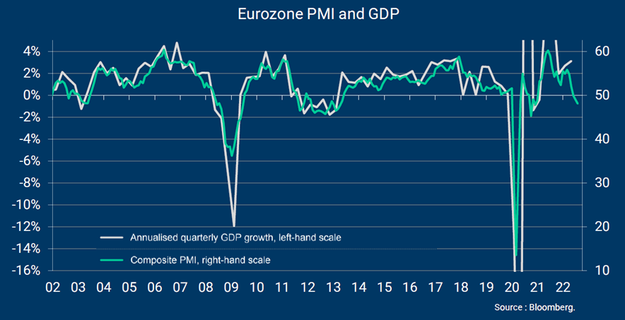 Hoewel de economische verzwakking momenteel bescheiden blijft, stapelen de tekenen van een achteruitgang zich op en moeten de gevolgen van de energiecrisis waarschijnlijk nog volledig voelbaar worden, omdat die momenteel verzacht worden door overheidssteun. Ondanks de hardnekkig hoge inflatie zou een verdere economische verzwakking de ECB ertoe kunnen brengen haar renteverhoging eind 2022 te pauzeren na twee nieuwe en mogelijk aanzienlijke verhogingen (50-75 basispunten). Een dergelijke pauze zou tijd bieden om de gevolgen van de maatregelen van de ECB te beoordelen. Momenteel voorziet de markt extra renteverhogingen ten belope van 100 basispunten voor de eerste helft van 2023.