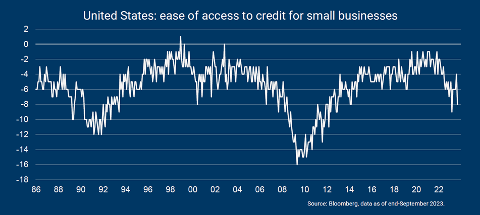 De golf van bankfaillissementen in de VS dit jaar (SVB, First Republic en Signature) leidde tot wijdverspreide bezorgdheid over de toegang tot krediet. Aangezien kleine bedrijven noodzakelijkerwijs afhankelijker zijn van banken als kredietbron dan grotere bedrijven, werden zij het hardst getroffen door de situatie. Dit is ook bevestigd door de bankenenquête van de NFIB, waaruit bleek dat eigenaars van kleine bedrijven in maart een sterke verslechtering ondervonden in de toegang tot krediet.