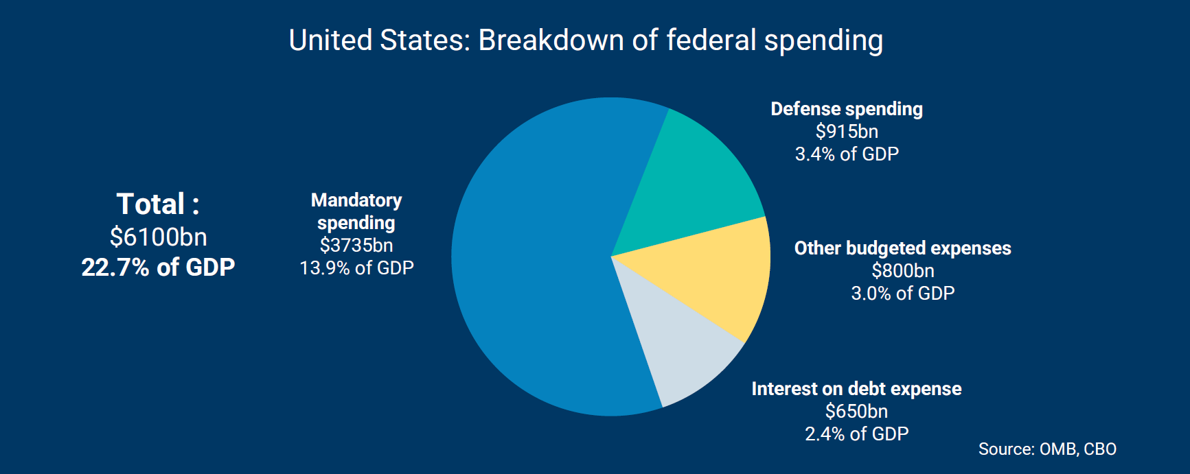 In 2023 zullen de federale uitgaven volgens cijfers van het CBO goed zijn voor $6.100 miljard of 22,7% van het bbp. 13,9% hiervan zijn verplichte uitgaven, omdat er niet elk jaar over de begroting wordt gestemd. Dit zijn voornamelijk sociale uitkeringen en gezondheidsuitgaven. 6,4% van het bbp bestaat uit uitgaven die elk jaar in de begroting worden opgenomen. Dit omvat 3,4% van de defensie-uitgaven. De rente op de schuld vertegenwoordigt 2,4% van het bbp. Volgens gegevens van het Office of Management and Budget vertegenwoordigen overdrachten aan huishoudens in totaal 68% van de federale uitgaven.