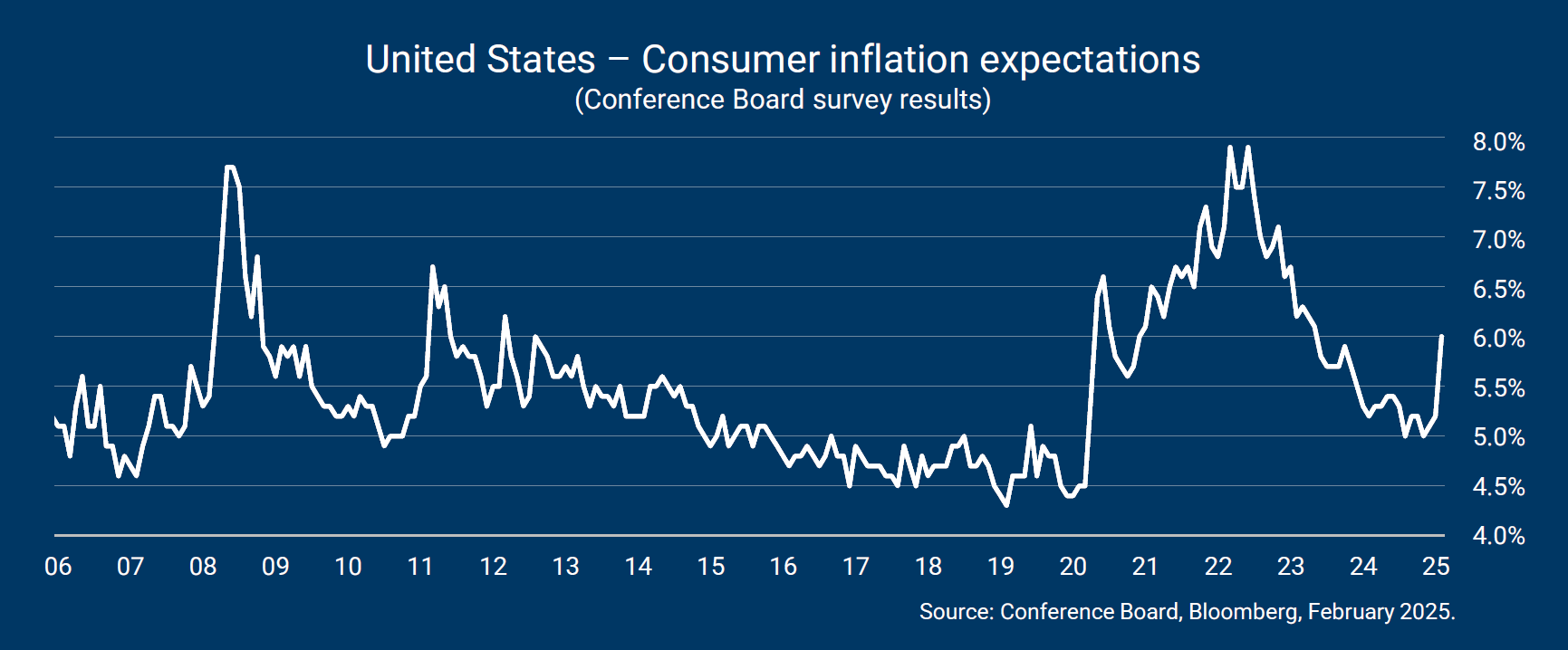 Historisch gezien is de inflatieperceptie van consumenten vaak hoger dan de werkelijkheid of de marktverwachtingen. De stijging van de laatste cijfers voor de bruto inflatie (3%) en de onderliggende inflatie (3,3%) in januari verzacht deze perceptie echter niet. De toegenomen dreiging van de nieuwe regering met tarieven heeft een duidelijke invloed op het gevoel dat de inflatie zal stijgen.