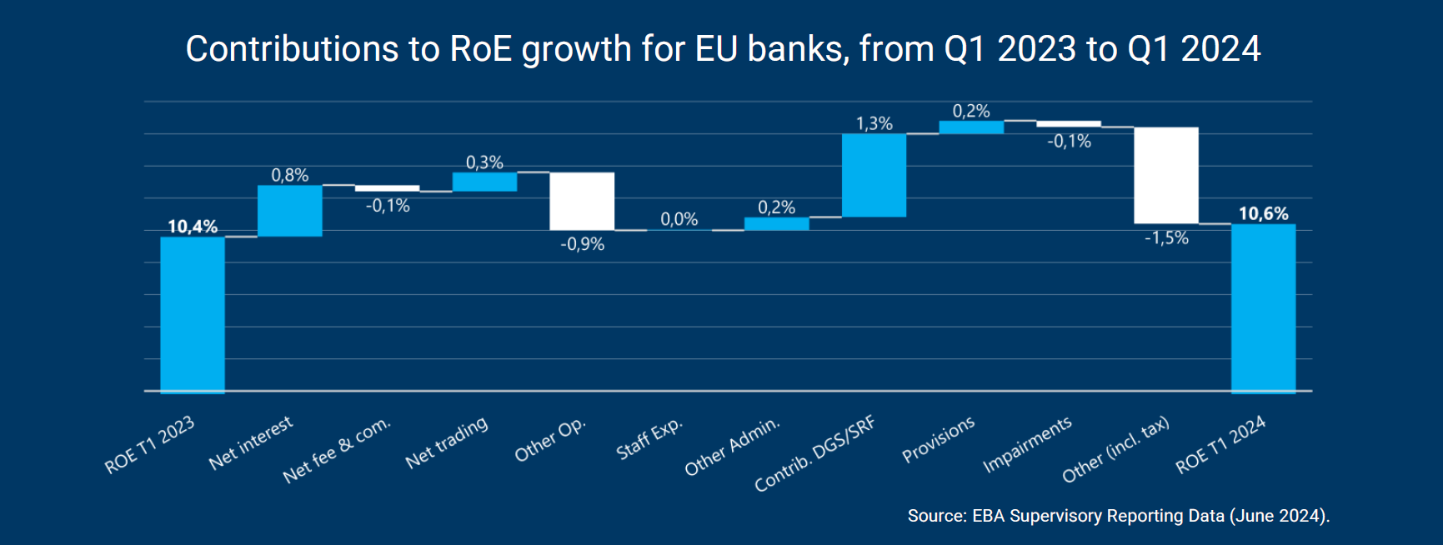 In haar meest recente Risk Dashboard geeft de Europese Bankautoriteit (EBA) duidelijk de verschillende factoren voor winstgroei aan die bijdragen aan de stijging van het rendement op eigen vermogen (RoE) voor Europese banken tussen het eerste kwartaal van 2023 (10,4%) en dat van 2024 (10,6%).